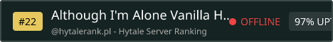 Although I'm Alone - Vanilla Hytale Server vanilla Hytale server. laid back community, no clout, We run Simple Claims so you can protect your builds, and CoreProtect for rollbacks when needed. A handful of quality of life tweaks. everyone gets 64 claim chunks. use wisely. Rules: No bullying No griefing PvP by consent only (managed through the Simple Claims party system) If you want a straightforward server without a ton of plugins or restrictions, this might be what you're looking for. Discord: https://discord.gg/pqfU2gcYm7