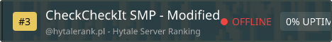 [OPEN WEEKEND STARTS NOW!] NO WHITELIST REQUIRED ALL WEEKEND ! Welcome To CheckIt SMP - A modified experience for the budding world of Hytale. We are a whitelist only server as Hytale begins to take shape, and players find their preferred communities. We wish to curate our founding members to ensure a positive and welcoming community experience. We have a short google form application process to ensure members are a good fit and will enjoy their time together <3 Community driven, looking to focus on : Economy and shops, towns, cooperative building, and events. A moderated, open community for users 16+. Currently our users are beginning to plan an open town near spawn, which any players are welcome to join! No exploiting, slurs or excessive use of abusive language, or griefing ! active moderation We are currently accepting new members ! Current modification list : Core : Essentials, TheEconomy, LevelingCore, SimpleClaims, Coreproect QoL : Tree Harvester, Less Sleepers, Easy Signs (NEW!) Additional : Violets Furnishings, Yungs Hydungeons, Macaw's Doors, windows, furniture, painting items, Better wardrobes ---- Application : https://forms.gle/HCAWwdKTSsne96za8