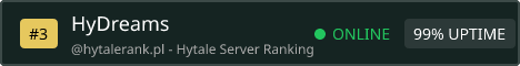 ⚔️ HyDreams — Server Settings ⚔️ 🌍 World and Gameplay Dimensions: Standard dimensions Difficulty: Standard difficulty PvP: Enabled KeepInventory: On Mob Griefing: Yes (protected inside claims) Max Players: 200 🛡️ Claims and Permissions Claim System: SimpleClaims Base allowance: 25 chunks Expandable via playtime or HyConomy Parties: Yes, included in SimpleClaims 💰 Economy and Progression Currency: HyCoins (HyConomy) Market: WIP Voting Rewards: WIP Real‑Money Benefits: None — no pay‑to‑win 📜 Server Features Modlist Transparency: Better Modlist Essentials: Homes, teleportation, spawn, mail Discord Bridge: Live chat sync, role sync, alerts