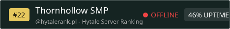 Thornhollow SMP is a long term, community focused Hytale survival multiplayer server built for players who love exploration, meaningful progression, and immersive fantasy worlds. Our server blends classic SMP values with Hytale’s evolving systems encouraging cooperation, player run economies, and organic storytelling shaped by the community itself. Whether you’re delving into dangerous lands, mastering new mechanics, building settlements, or role playing your character’s journey, Thornhollow is designed to feel alive and ever changing. We prioritize: A fair, welcoming community Survival first gameplay with room for creativity Player freedom without pay-to-win mechanics Regular updates aligned with Hytale’s development A strong sense of world identity and progression Thornhollow SMP isn’t just a server it’s a shared world where your actions matter, your builds tell stories, and every update opens new paths to explore.
