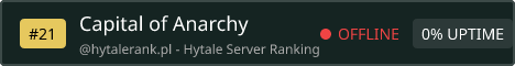 Welcome to **Capital of Anarchy** – the ultimate Hytale anarchy server with 200 slots! **Launched on Day 1:** Started the day Hytale launched (January 13, 2026) – the original world is untouched and will **NEVER be reset**. Pure history in the making! **No Rules – Pure Chaos:** - PVP, griefing, hacks – everything allowed! - No bans, no mercy. - Build your bases, destroy others – survive or die! **Create Your Own Story:** - Join and be part of epic tales – forge alliances, wage wars, or go solo in endless chaos. - Make new friends (or enemies) from around the world, build communities, and experience unforgettable moments. - Discover the thrill of true freedom: endless exploration, massive builds, rare finds, and the satisfaction of outsmarting others in a rule-free world. **How to Join:** 1. Open Hytale → Servers → Add Server 2. IP: **capitalofanarchy.org:10250** 3. Join and become part of the history!