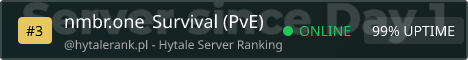 A day 1 survival server without PvP. Experience Hytale's vanilla Adventure mode against the environment of Orbis alone or with friends. There is a 100% drop resource death penalty here. That is to encourage team/faction forming and make resources/equipment matter. As a community open to everyone, we speak English on our servers.