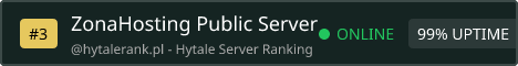 Free for all survival Hytale Server provided by ZonaHosting (great cheap hosting). You can get your server for free of for very cheap at our website!!