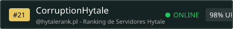 Explore a living fantasy realm filled with ancient ruins, cozy villages, dangerous dungeons, and untamed wilderness. Whether you’re a fearless adventurer, a master builder, a trader, or a storyteller, your choices shape the world around you. ✨ What We Offer 🗺️ Custom RPG Gameplay – quests, progression, skills, and lore 🏰 Immersive Survival & Exploration – balanced, rewarding, and fair ⚔️ Challenging PvE & Optional PvP – monsters, bosses, and epic encounters 💰 Player-Driven Economy – trade, markets, and meaningful progression 🎨 Creative Building – protect your land and bring your ideas to life 👥 Friendly Community & Active Staff – fair play 🔮 Our Vision We aim to create a server that feels alive and welcoming a place where medieval fantasy meets subtle high-tech systems, without losing the magic of discovery. Every update is designed to expand the world while keeping gameplay fun, balanced, and rewarding. Whether you play solo or with friends, for roleplay or combat, casually or competitively CorruptionHytale is a place you can truly call home. 🚀 Join the Adventure 📌 Version: Latest Hytale Release 🌐 Community: Discord & Events ⚙️ Always Evolving Your legend starts now.
