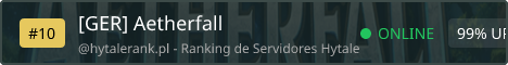 Aetherfall ist ein neuer, frischer und anfängerfreundlicher Hytale-Server mit deutscher Community. Entdecke und baue gemeinsam mit anderen Spielern und erlebe spannende Abenteuer in einer offenen, freundlichen Umgebung. Pures Vanilla-Erlebnis! Ausnahmen sind folgende Mods: SimpleClaims (Geschützte Chunks), Hyssentials (/tpa /homes /sethome..)