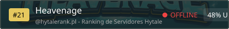 Heavenage — ванильный русский сервер Hytale, созданный как стабильный и долгосрочный дом для игроков. - На релизе мы делаем упор на чистый vanilla SMP, чтобы игроки могли изучить Hytale в его базовом виде. - Доступен PVP мир, с достаточным количеством слотов для всех и плагином SimpleClaims для защиты своей территории. - В дальнейшем сервер будет развиваться в RPG-направление с новыми механиками и контентом, такими как торговля, данжи, способности, экипировка, - Мы не собираемся использовать P2W или агрессивную монетизацию — честная и сбалансированная игра всегда останется в приоритете. Discord: https://discord.gg/dkWgxgx4