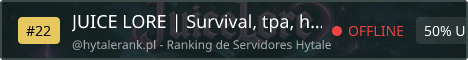 Welcome to Juice Lore, a living Hytale world built around adventure, survival, and exploration. Juice Lore offers a carefully crafted experience where every journey matters. Explore diverse biomes, uncover hidden dungeons, face dangerous creatures, and progress through a balanced survival system designed for long-term gameplay. Whether you prefer exploring the unknown, building your own place in the world, or surviving alongside friends, Juice Lore gives you the freedom to play your way. Our server focuses on fair progression, custom mechanics, meaningful exploration, and an active community. No shortcuts, no pay-to-win — just a world shaped by the players who inhabit it. Enter Juice Lore and begin your story. Server IP: juicelore.com